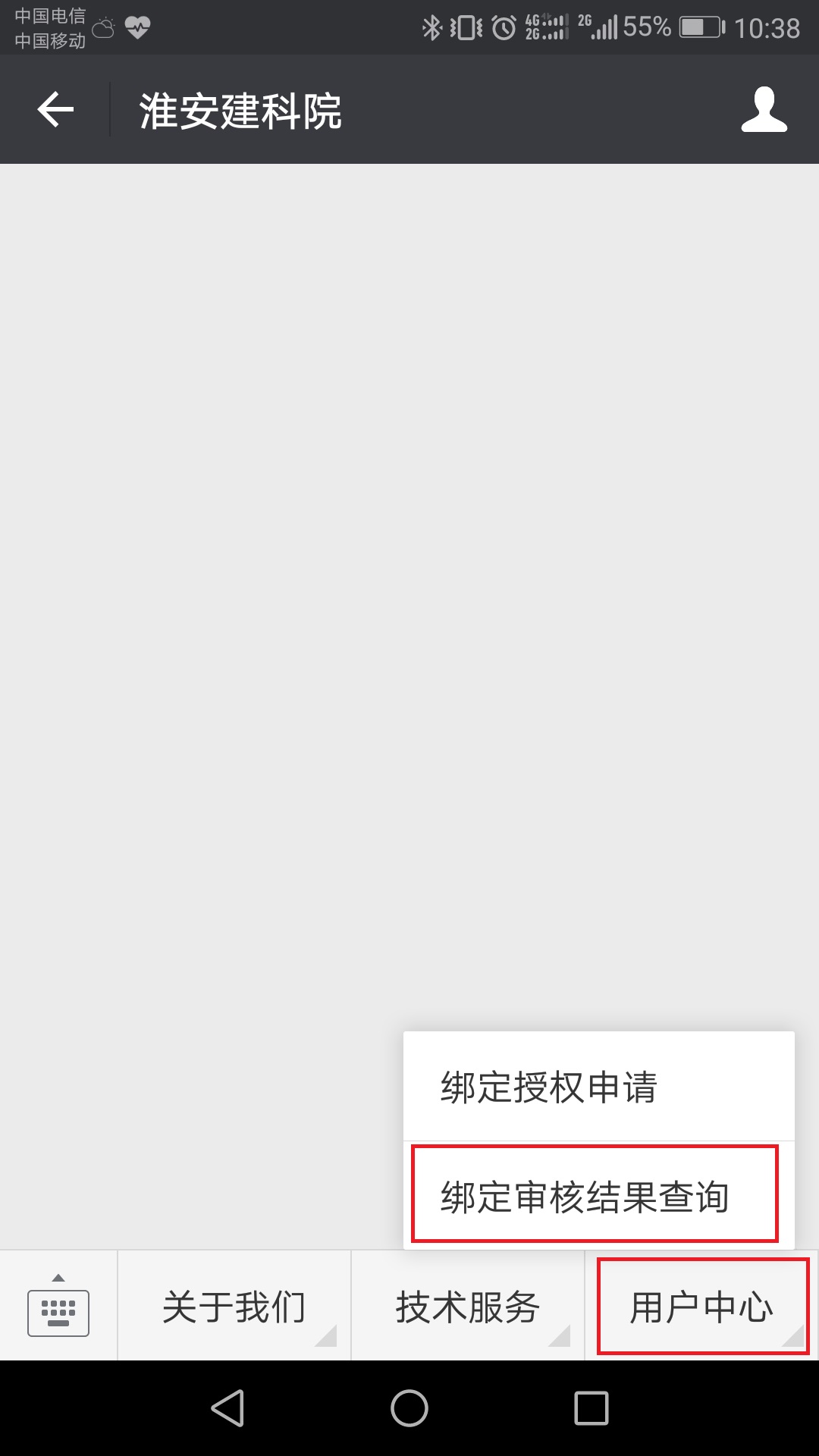 2、首次使用的用戶,進入公眾號之后,請點擊最右邊“用戶中心”菜單,選擇“綁定授權申請”,輸入相應信息后,提交申請,等待管理員審核。